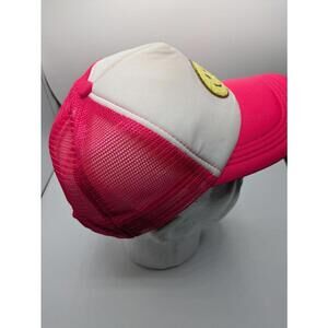 Add a splash of fun to your outfit with this eye-catching pink smiley face cap! This stylish trucker hat features a bold pink brim, a white front with a glittering smiley face patch, and breathable mesh fabric at the back. Perfect for summer outings, beach days, or casual wear, this cap is both fashionable and functional. The adjustable snapback closure ensures a comfortable fit for all head sizes. Stand out in the crowd with a touch of whimsy and positivity. Ideal for anyone looking to express their playful side.