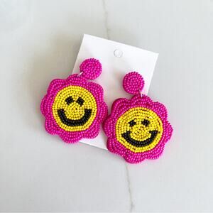 Smiley Face Flower Pink Yellow Beaded Pierced Earrings • NEW
