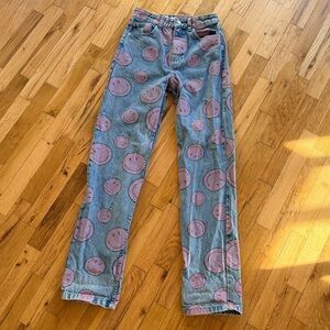 High waisted pants with purple smiley face print. Size 4 (27). Excellent condition, offers welcome