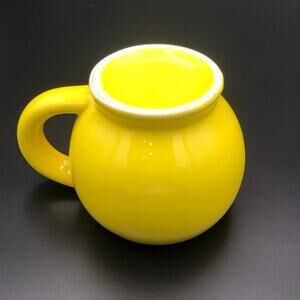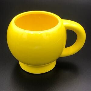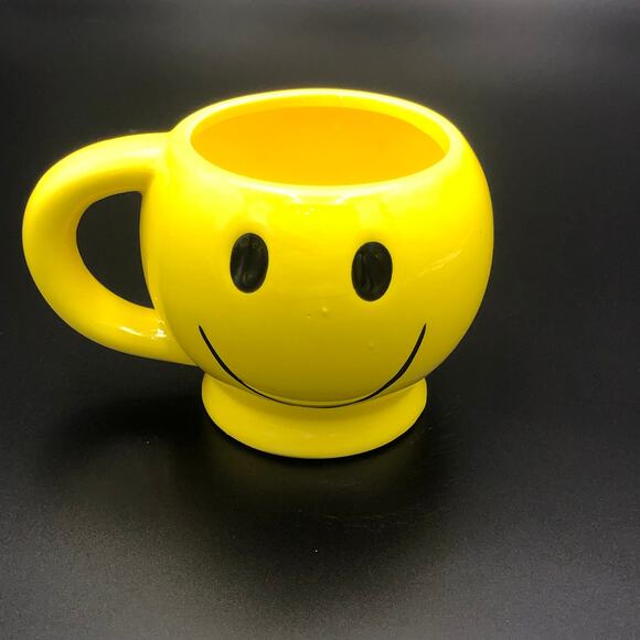 Yellow smiley face mug in good condition. 4.25 diameter, 3.5" height, and overall width 6".