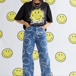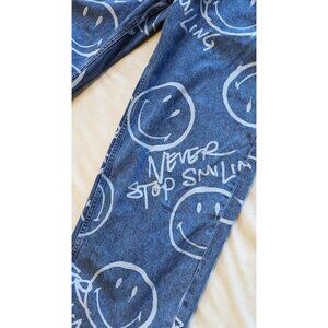 Smiley Originals X H&M collab Baggy Loose Fit jeans graffiti Smiley Face "Never stop Smiling" high rise waist. zip fly and 5-style pocket
