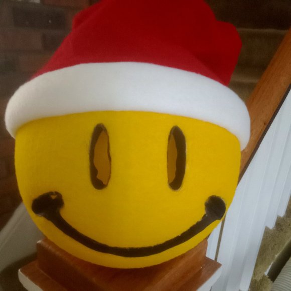 Vintage ...SMILEY FACE with Santa Hat Deco... 9" diameter... Resin with a felt hat...plug-in electric to see fiber optic lights of changing colors... a FUN table-top display...INDOOR USE ONLY...pre-loved /good condition...by Trendsetters, Inc...made in China....***includes AC adaptor/120V/64" cord***tested OK