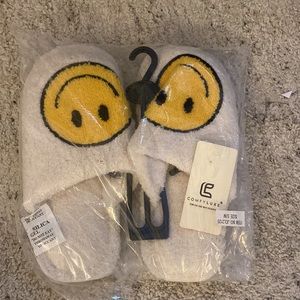 Barefoot dreams dupe slippers with yellow smiley face. Extremely comfy and soft! NWT S/M