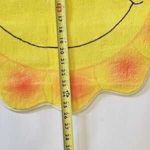 Brighten your space with this cheerful smiley sunburst rug. Features vibrant yellow and orange colors.