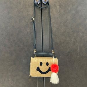 Super cute vinyl bag with straw flap with big smiley face. Magnetic snap. Small zippered pocket in main compartment and 4 card slots on opposite side.