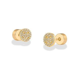 Don't worry, be happy. And wear it, too. Wear your biggest smile with this 6mm stud flatback earring pair featuring 14K yellow gold plating, premium cubic zirconia stones, and screwback posts.