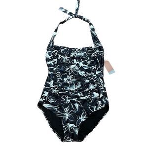 Dive into style with this elegant floral halter one-piece swimsuit. The black and white design offers a classic look perfect for any beach day.