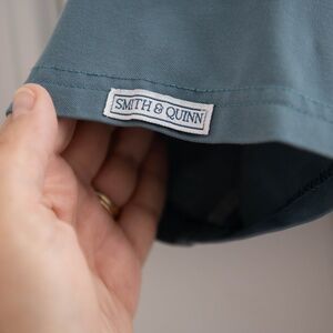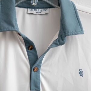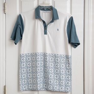 This Smith & Quinn Golf Polo Shirt is a Mens size Medium. Unique Golf Ball Print on lower half with blue sleeve and collar accents! Excellent pre-owned condition!