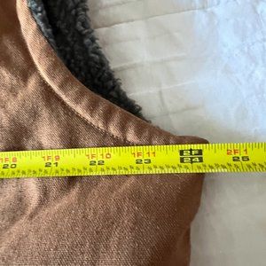 Smith and Rogue Men's Canvas Original Reversible Vest Sherpa Pockets. See photos for accurate description along with measurements. This original canvas is made from hemp fibers and poly fibers to bring ultimate strength and durability to the canvas. It is stronger and last longer than traditional hundred percent cotton duck fabrics. The original canvas reversible vest is also treated with durable water repellent, see to keep the canvas from soaking up water or spills. The pockets on this baby are lined with Polartec fabric to keep those paws toasty on those early mornings setting fence. Not to mention chin. This is a reversible vest for the days that need a prospective shift. Abrasion resistant, no breaking needed. Riveted pockets. no size tag, use measurements.