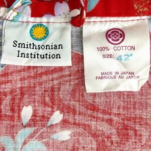 Size 42 (about a Large) Smithsonian Institution kimono/yukata. Red cotton fabric with a floral/geisha print. One pocket. No tie/belt. Made in Japan. No flaws, great condition!