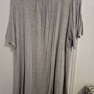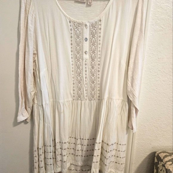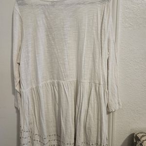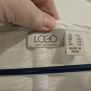 This is from the LOGO collection. In good shape. Whit with silver/gray embroidery. Wear with gray pants, skinny jeans. I wore this with gray ankle dress pants and sandels or flats to work. The material is soft and cool. Sleeves are quarter length.