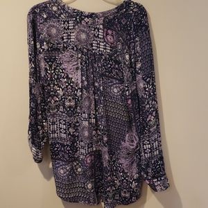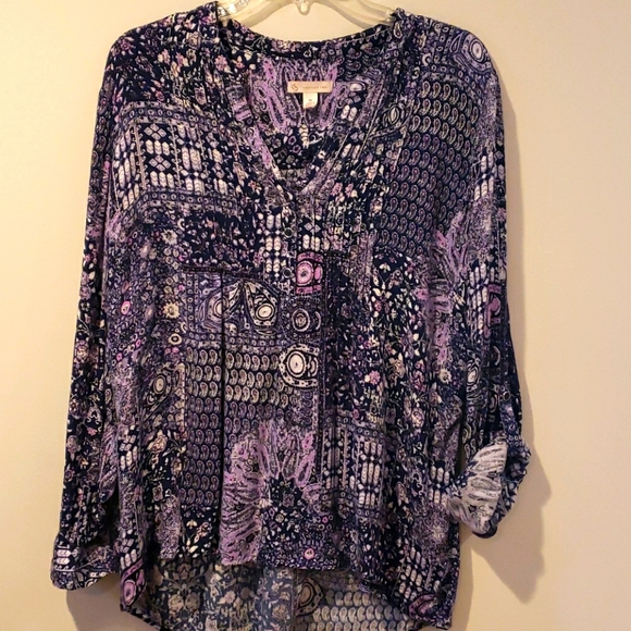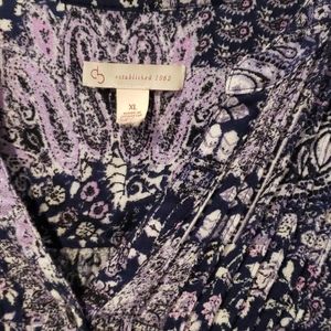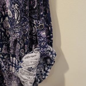Beautiful dark blue with lavender accents. Sleeves can be rolled up and held up by button closure or long sleeve. Shown with 1 sleeve up and one down.
