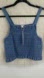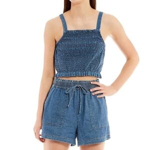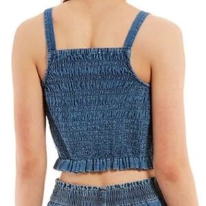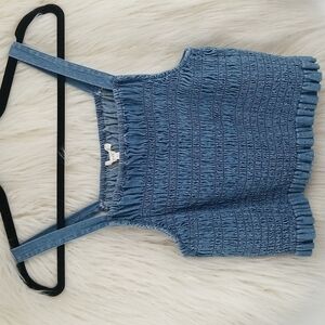 100% Cotton Medium Wash Blue Jean Stretchy Smocked Thin Strap Top with Dainty Pleated Peplum Waist Detail. Perfect For Every Season!