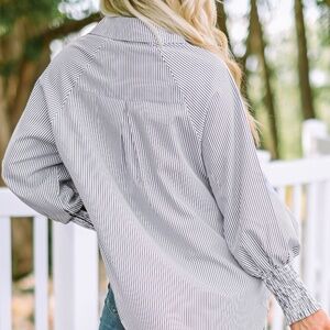 Add a touch of elegance to your everyday look with this timeless black and white striped blouse. Featuring a relaxed fit with chic details, it’s perfect for work or casual outings. The smocked cuffs on the balloon sleeves add a subtle statement, while the button-up front and pointed collar keep it classic.