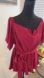 This vibrant red blouse features charming flutter sleeves and a smocked bodice for a comfortable fit. The tie front adds a playful touch, while the peplum hem creates a flattering silhouette. Perfect for adding a pop of color to any occasion.