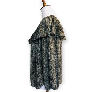 Flowy bodice with Elastic at Neck/Shoulders & Sleeve endings and Gypsy Neckline with a Ruffle trim which can be worn on or off the Shoulders. Made of 100% Polyester
