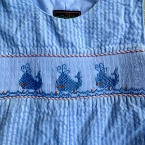 Smocked Jon Jon by Sweet Potato kids. Adorable light blue and white seersucker body with smocked whales on the front panel. Button closure at shoulders and snap closure at bottom. Lined. Perfect for summer! Can be worn with shirt underneath. The size on the tag has worn off, but it was worn in the 6-9 month range. Very good condition. Smoke free home. Original retail approx. $36.