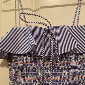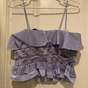 Smocked blue top from Endless Rose. It has ruffles on top and bottom. The stitching is rainbow and colorful. There is a tie in the middle and zipper in back. The color is powder blue and size small. The top has not been sold in 4 years.