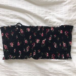 Smocked underwire bandeau bikini top from Target (Xhilaration) in black floral. Strappy back with ties that let you find the perfect, adjustable fit. Very supportive and comfortable.