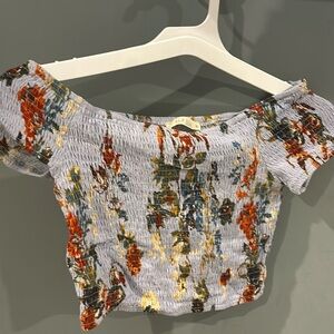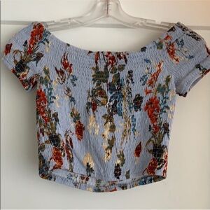 Patterned smocked crop top. Gorgeous light blue color with pattern. Fits off the shoulder or over the shoulders. Size large but could fit someone size XS- L due to the smocked material.