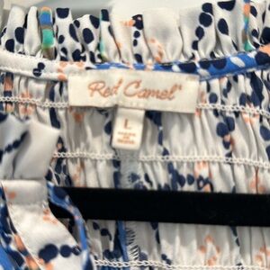Smocked red camel shirt with buttons and smocked sleeves.