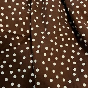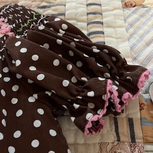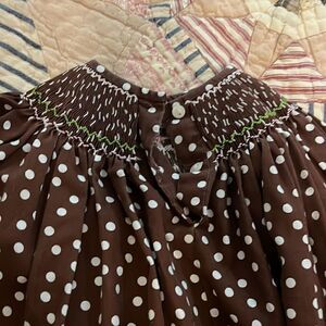 Beeman brand size 18 months brown and white polkadot, pink Rick rack around the sleeves and Smocked poodles around the neck