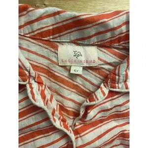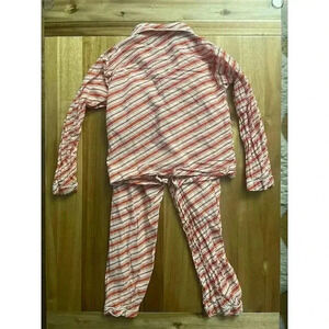 The Smockingbird pajama set in size 6Y features a vibrant red and white striped pattern. Designed unisex, this long-sleeve set is made from soft, comfortable fabric, ensuring a cozy fit. The button-up closure adds a classic touch, and the set is machine washable for easy care. Perfect for bedtime or lounging at home, this pajama set is ideal for everyday wear. The item is pre-owned.