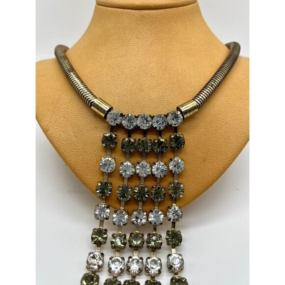 Step up your jewelry collection glamour game with this lovely and substantial waterfall cascade necklace that has clear and smoke-colored glass rhinestones. Long round snake chain in gold-tone metal. The necklace's drop from the shoulder point to the bottom of the rhinestone cascade is 20.5". Metal tag near the clasp reads Tasha. Weight of necklace is 4 ounces. Please see the photos as they are an important part of the overall description.