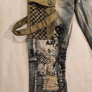Smoke Rise Cargo Fashion Denim Streetwear Street Ware Wear Mens Jeans Doodle Utility Get it Skull Skullys Cross Bones Travel Advisory Rebel Spirit Born Free RN 82930 SR91