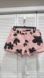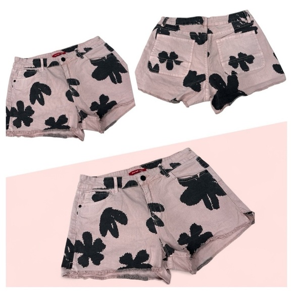 These jean shorts feature a striking black floral print against a soft pink background, offering a stylish and comfortable fit. Designed with a relaxed cut and an elastic waistband, they are perfect for casual outings. The bold, abstract floral pattern adds a touch of flair to your everyday look. Size L pre-owned good condition
