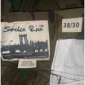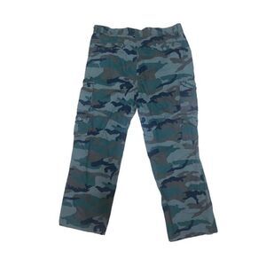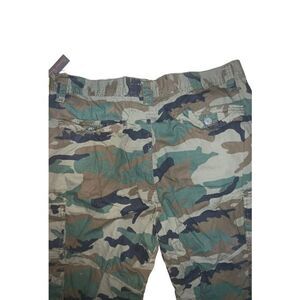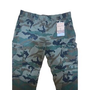 Classic green multi camouflage cargo pants. Multiple pockets. Drawstring hem. Belt loops. Button and zip closure. 100% cotton. Size: 38X30. NWT.