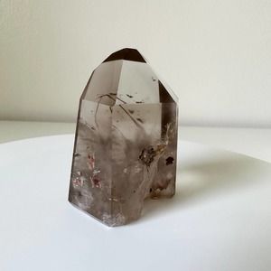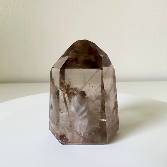 Stunning smokey Amphibole Quartz with a lot of clarity and some fibrous peach and white inclusions.