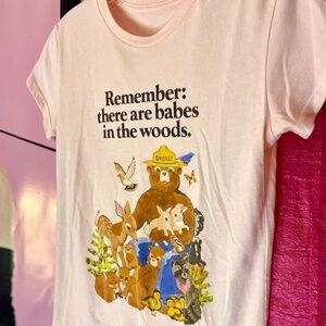 Don’t let him down: grab this novelty tee today! Best for those who prefer the figure-enhancing t-shirts, thanks to our perfectly proportioned slim fit. Made of the palest of pinks, this cotton blend will forever advertise Smokey’s message: there are babes in the woods 🪵 🐻🦊🐰💗