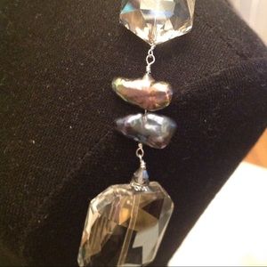 Crystal/Baroque Pearl Necklace. On a Sterling Silver Chain. Rhinestones around the large crystals. Crystals are smokey grey, baroque Pearls are a iridescent purple color. Crystal shapes are emerald, round, & pentagon. Strung on a Sterling Silver Chain. Lobster closure. 925 stamped on the closure.