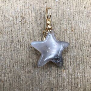 Smokey Chalcedony stone found, cut and polished. Star shaped gold colored wire wrapped. Pendant only.