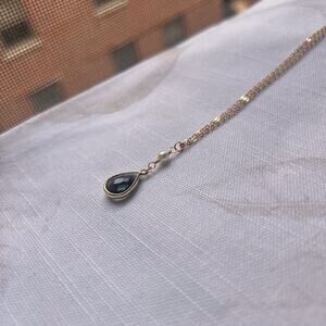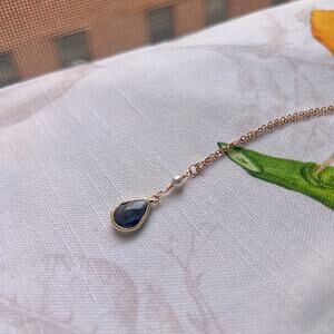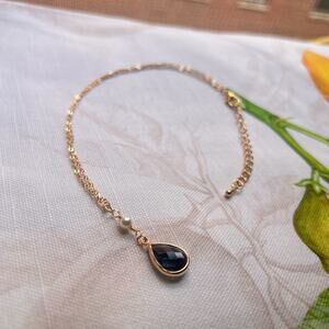 Gold necklace features a pearl bead and gray black jumbo crystal glass jewel. Chain is adjustable from 15-18". Also available as a set.