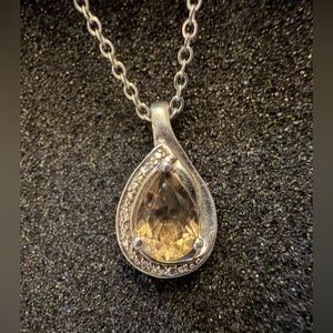 Elegant, vintage inspired smoky quartz teardrop/pear shaped and CZ accent sterling silver pendant with 18in chain. Has JWBR 925 engraved on back of bail.