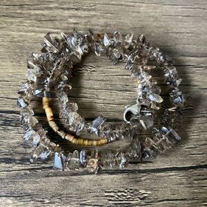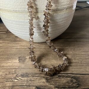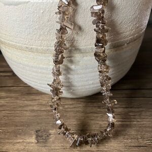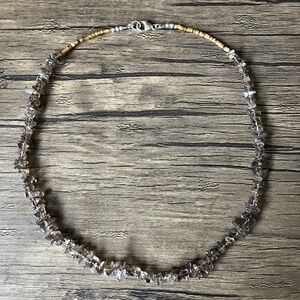 Beautiful sparkly gray and brown smoky quartz necklace with tiny shell bead accents and silvertone lobster clasp.