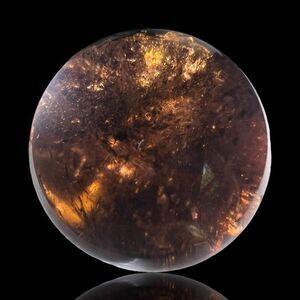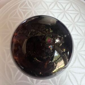 A dark smoky quartz crystal sphere marble, mostly translucent, reveals mesmerizing rainbow flashes when illuminated by a flashlight. This enchanting stone, known for grounding and protective properties, absorbs negative energy and fosters emotional calmness, aiding in stress relief and clarity.