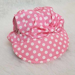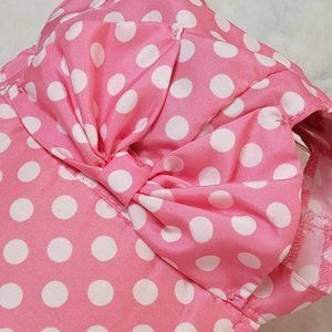 Hat details: Material is pink with white polkadots adorned with a bow on front above brim. Adjustable elastic chin strap. Holes on the sides to slip over the ears. Please see measurement chart on how to determine if this hat will fit your dog properly.