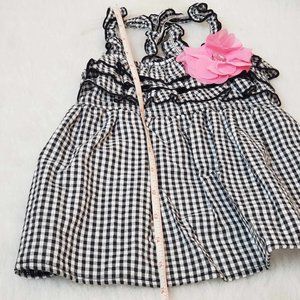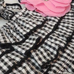 Dress details: Material is black & white gingham print embellished with a pink flower that has a clear stone in the center. Skirt is lined with a single layer tulle. Elastic shoulder straps that criss-cross at the chest. 3 rows of ruffles along the bodice. One velcro closure for ease of putting on & taking off, but is not size adjustable. Dress measures 16 inches from shoulder to hem.