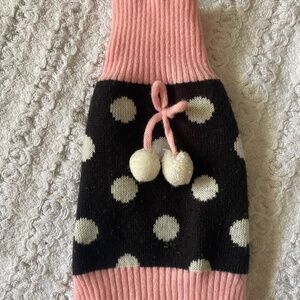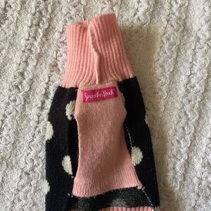 Smoochie Pooch poke-a-dot XXS dog sweater black with white dots and pink trim. Very cute. Used very good condition. My chihuahua wore this a few times she was about 5 or 6 lbs. it is a little stretchy.