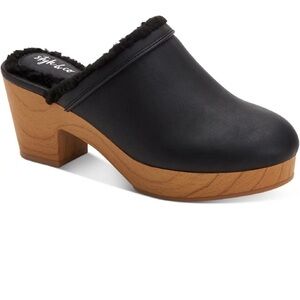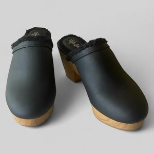 Smooth Black Leather Heeled Clog Mule Sherpa Lining Size 10 Dark Academia Goth