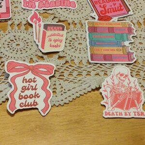Bundle of 16 new medium to large size peel-off stickers, all about books. Theme: Smut, Trashy Novels, Spicy Books. These might be fun to give out at a book club party. You get 16 beautiful new peel-off stickers for crafts projects, scrapbooking or for use on computer, locker, etc. Tear-resistant, good for most uses but since non-glossy matte finish, not best for water bottles.