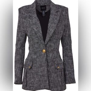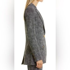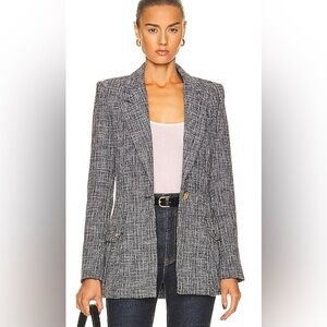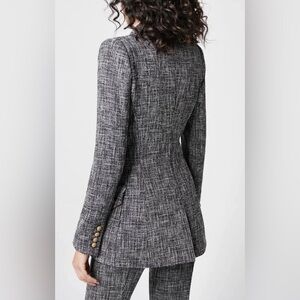 The Cargo Pocket Longline Blazer in Black Tweed by Smythe is a tailored longline blazer featuring cargo pockets, a notched collar, and brass hardware. Pair back to the matching Pintuck Flare Pant for a coordinating suit look.