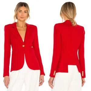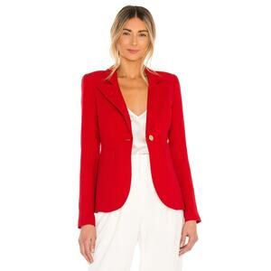 Smythe Classic Duchess Blazer in Red. Size 4. Features padded shoulders, long sleeves with button cuffs, front welt pockets, gold hardware, notched cut out back, lined, single button closure. 100% wool. Style AS2001. NWT / New with tags.