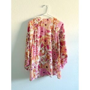 Keywords: Smythe, kimono, floral kimono, open front, cover up, lightweight, bohemian, boho, pink floral, orange floral, small, petite, S/P, blouse, top