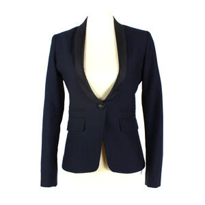 SMYTHE NAVY BLUE WOOL BLACK SILK BLEND SATIN TRIM SINGLE BUTTON BLAZER