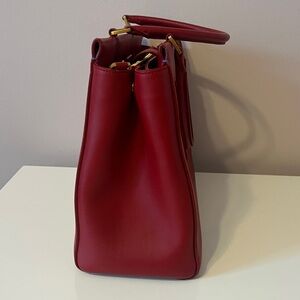Gorgeous vintage leather tote from British luxury brand Smythson of Bond Street. Classic and timeless Ruby red leather and gold/brass accent hardware.