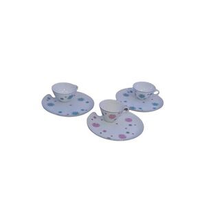 This vintage Shafford snack plate set from Japan features a unique starburst/snowflake pattern in pink, white, and blue. The set includes three plates with a diameter of 7 & 7/8" each. The glossy finish and geometric shape make these plates a great addition to any mid-century modern decor.
